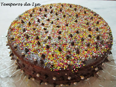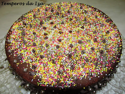 Recheie e cubra o bolo, com a cobertura/recheio ainda quente. Quando o bolo estiver quase frio decore a gosto com as pepitas de chocolate, as grajeias douradas e as pepitas coloridas.