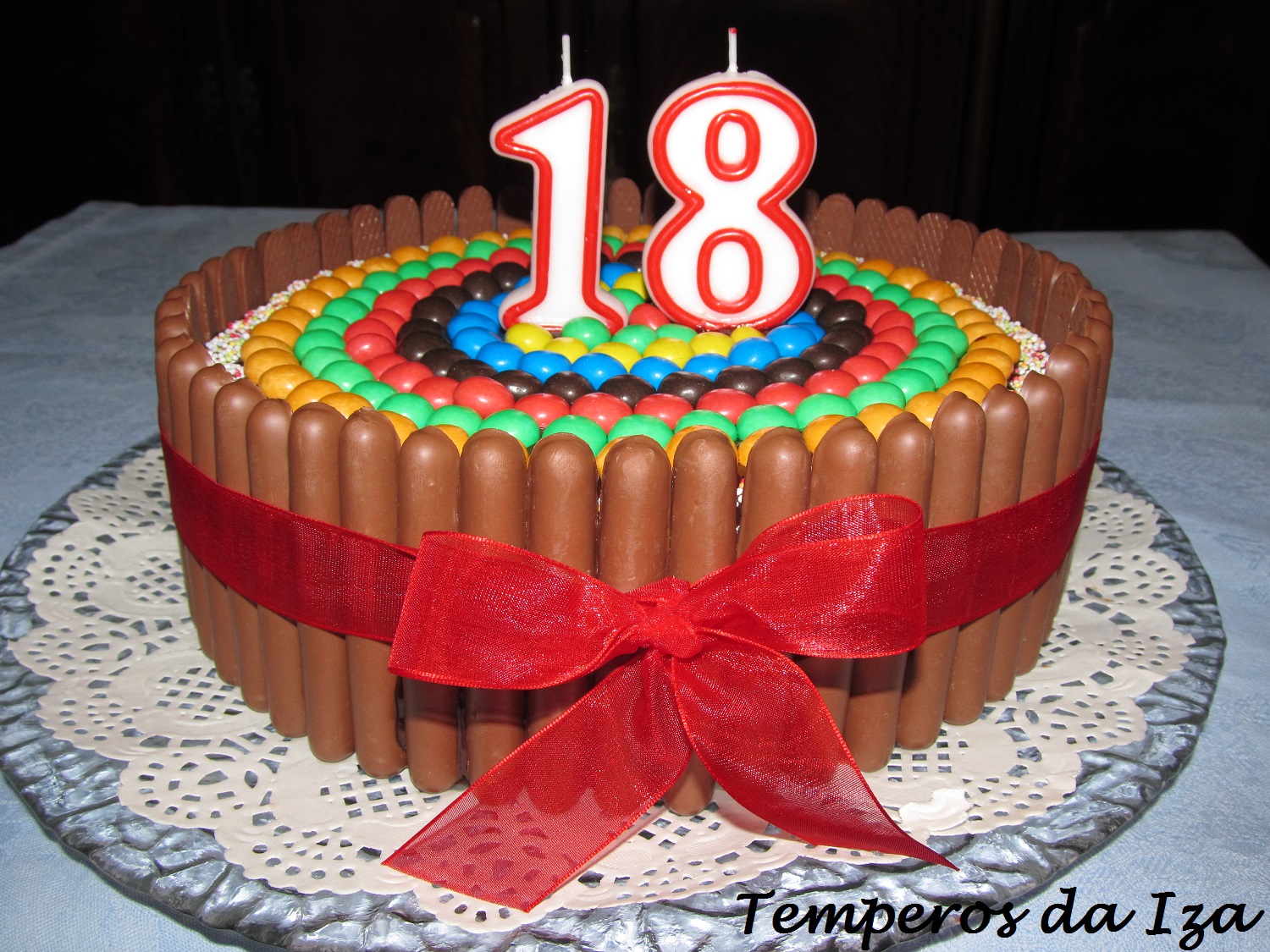 Deixe arrefecer um pouco e comece por colocar os palitos de chocolate à volta do bolo. Coloque a fita e faça o laço.