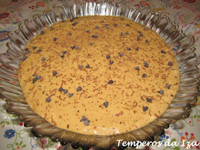 Verta para uma taça grande, decore a gosto com pepitas e raspas de chocolate.